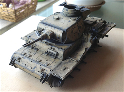 The damage inflicted is primarily on the left side of the suspension and fender. It is to represent the result of an anti-tank mine detonation under the tracks (or, perhaps, medium-caliber shell explosion in a very near miss -- still wondering what back story to have in my head ).