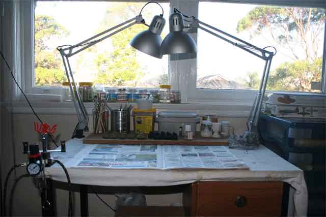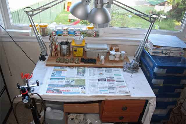 Here is my workbench/stash/computer room. I get good natural light and also useful ventelation when I am spraying.