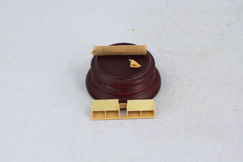 Steps 6 and 7 deal with the rear hull details with Step 6 assembling the air exhaust deflectors, the muffler and heat shield, and the tow hitch. The heat shield was annealed over the gas burner flame on my kitchen stove, then curved to shape using the metal handle of my Xacto knife to get it close to the required curve and the muffler itself served as the former to get it curved the rest of the way. I drilled out the muffler exhaust pipe since the kit supplied part just had a molded depression for its mouth.