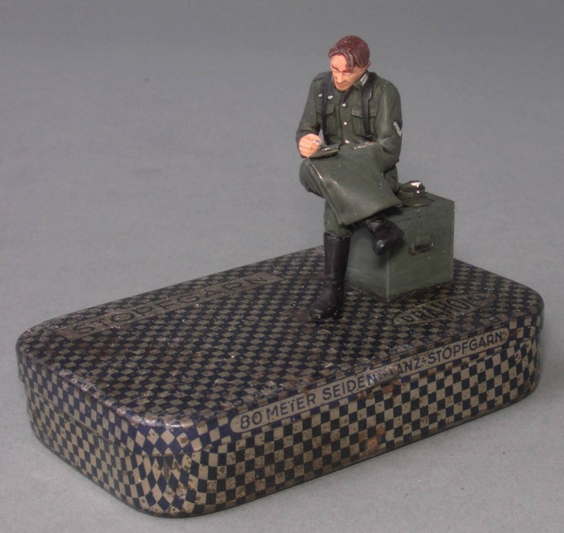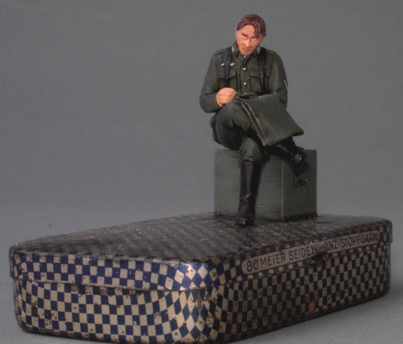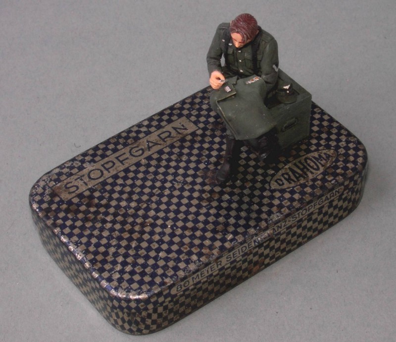 Here is Gefreiter Huber, sewing his captainīs jacket. The figure is fixed on an original silk-thread box. The jacket is made from lead foil, added a shoulder board (PE), collar tab (PE) and a few buttons.