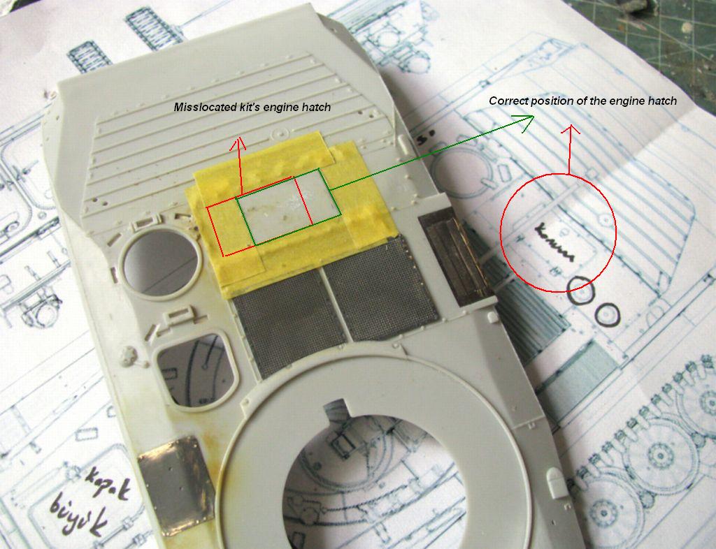 Then I've started working on upper hull. There are so many things to correct here. I started from front engine hatch. Location of the engine hatch was not correct. I filled the wrong lines with CA, sanded and using blueprint and real photo of vehicle, I determined the correct position of the hatch.