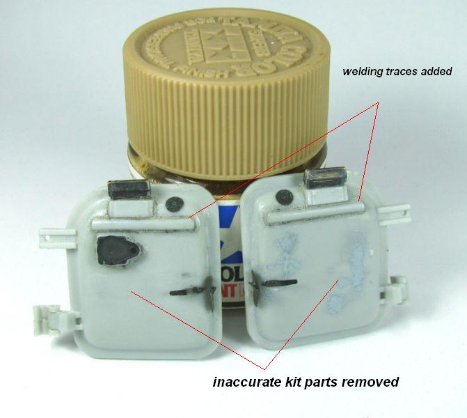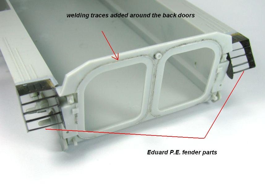 Inaccurate kit parts of the back doors removed and rest detailed with Eduard parts. Welding traces also added.