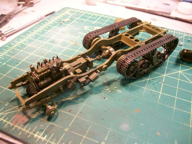 Here the exhaust is in place, used MM Metalizer Burnt Iron for the manifold and exhaust pipe. Note, install the exhaust support BEFORE you finish the tracks, it weren't easy putting it in place.