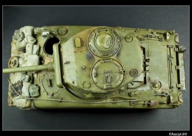 I was very disappointed after opening a box, because the body of tank haven’t got a right shape and the turret comes from M4A3 version instead of M4A1, so I was forced to change casting numbers place. I have also rebuilded split hatch. The hardest part was to fill some holes that I found between lower hull and tank body.