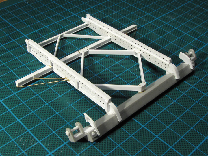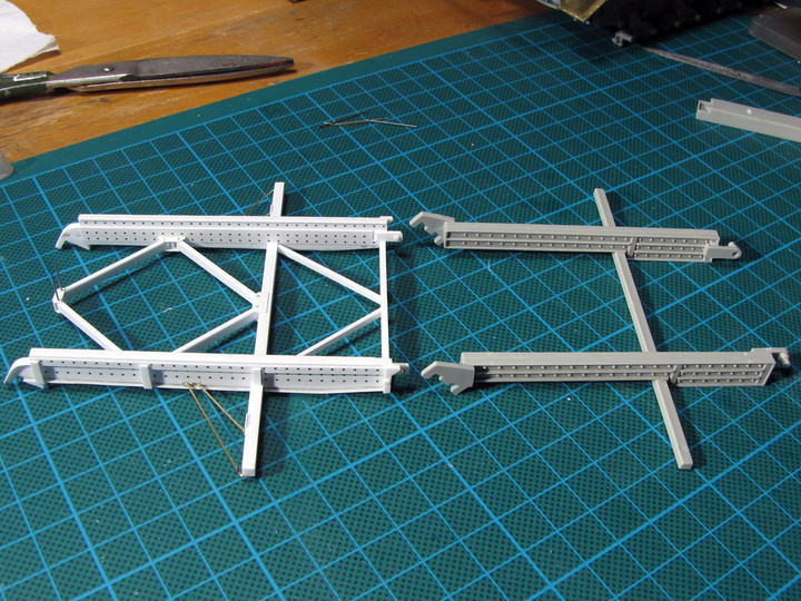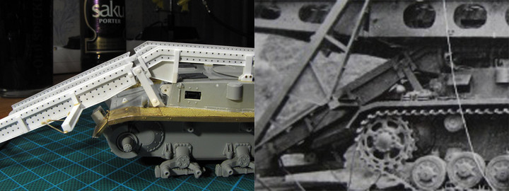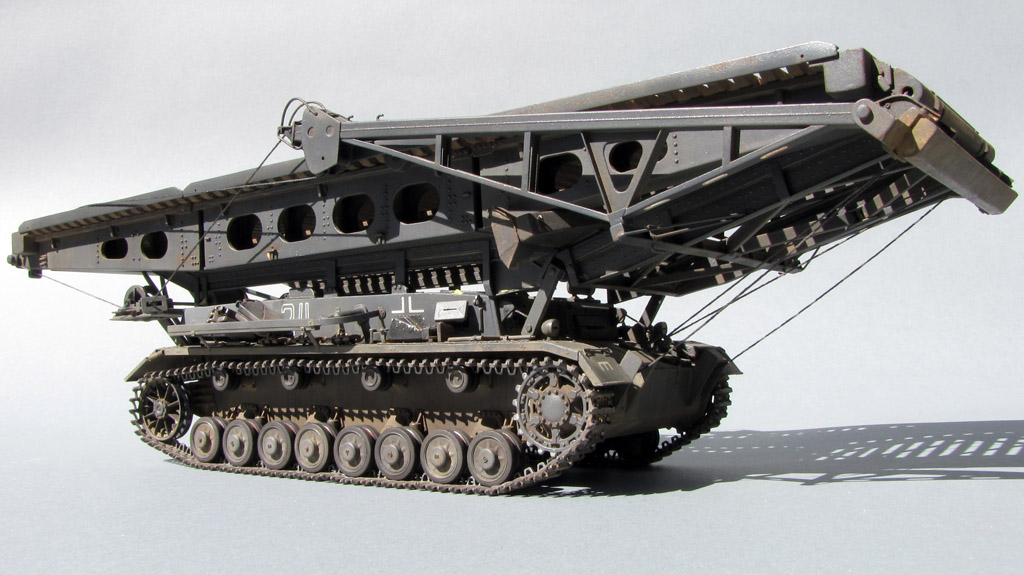 I have used Dragon's Panzer IV Ausf.D as base model and Trumpeter's Brückenleger kit as bridge as Trumpeters panzer IV chassis are poor compared to Dragons. Also there have been lot of problems with Trumpeter's kit bridge laying mechanism, as it isn't partly even similar as seen on the photos. So I have been using lot of Evergreen styrene to make it scratch. However the bridge itself seems to be quite accurate.