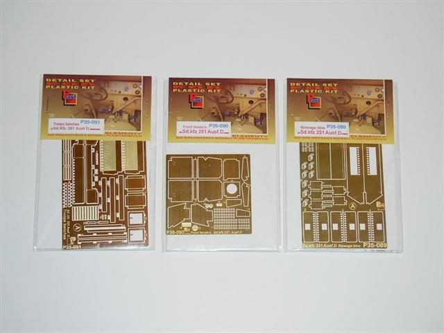 3 photoetch sets by Part: Troop Benches, Front Bumper, and Storage Boxes