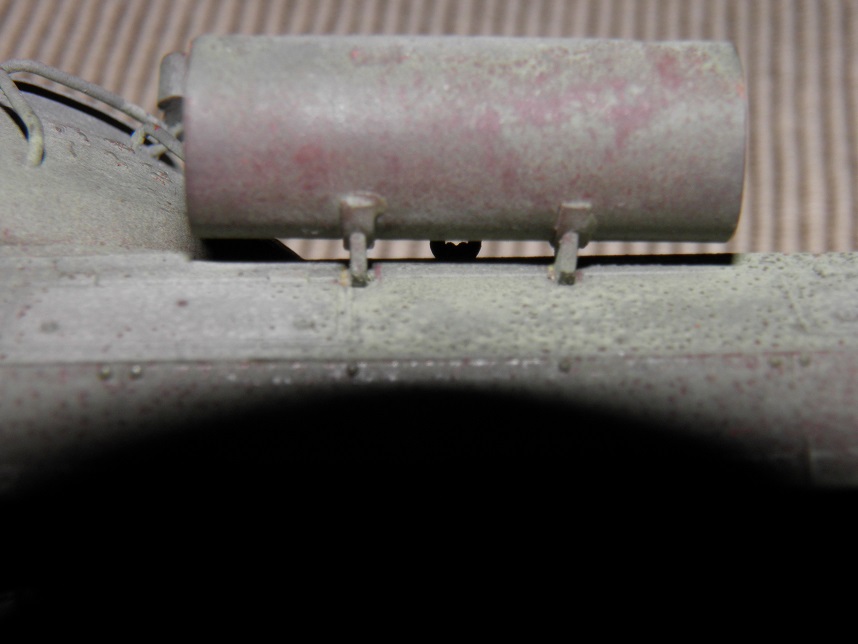 In the state seen here I just finished the base painting and weathering process. I airbrushed a base layer of Vallejo Hull Red and Black Grey thinned with Tamiya acrylic thinner. Once that was dry I moistened the model with a light mist of water and went to work spreading ground salt on the model. Once that was dry I sprayed it with the base color, an odd mixture of Tamiya and Vallejo acrylics that did not completely agree with one another, but went on well enough to get the model painted. I cant off-hand recall what my mixture was, and it came out slightly greyer that I had wanted, but it gives a good impression I think of paint that is oxidized heavily, and might have patches of a primer showing through. The real model is considerably darker and greener in color than the photos appear. Please bare in mind that I've just begun the weathering process. I think I'm starting to get the hang of the salt technique, and like the results I'm getting from it. This model is perhaps a bit over-weathered for a period piece, but I think it looks good.