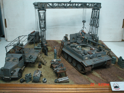 Hi to all, here are some photos of a diorama I finished last November the models are from different manufacturers like, Academy tiger 1 early w/interior,DES resin gantry crane,italery opel w/verlinden conversion and finecast resin German generator.the accessories are from verlinden, some cast crates,lion roar PE tools and italery......