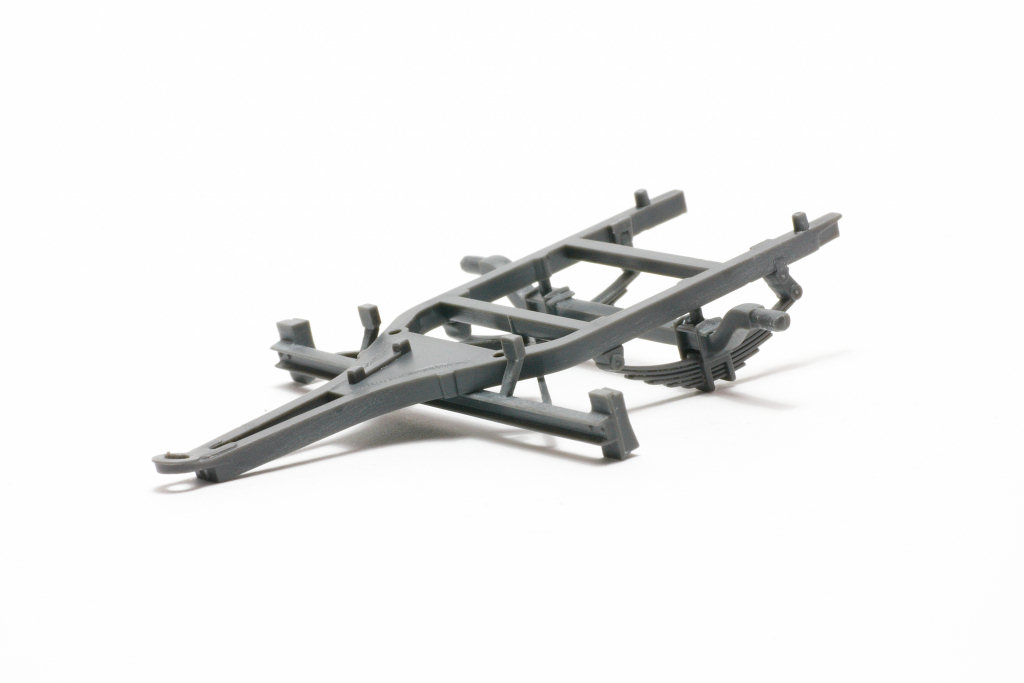 Construction starts with the chassis of the kitchen. The parts here, particularly the leaf springs and axle required quite a bit of cleaning up due to the moulds being misaligned. (Click on the photos to see a larger image.)