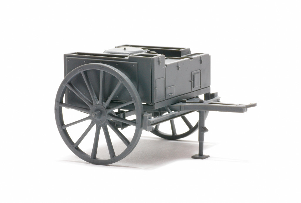 In the box are two sprues of dark grey plastic, one each for the kitchen and the limber and two sprues of white plastic for the horses and figure. Also included is a rectangle of flexible plastic to make the harnesses.