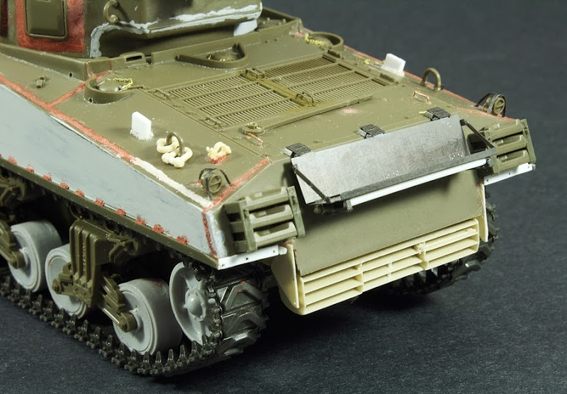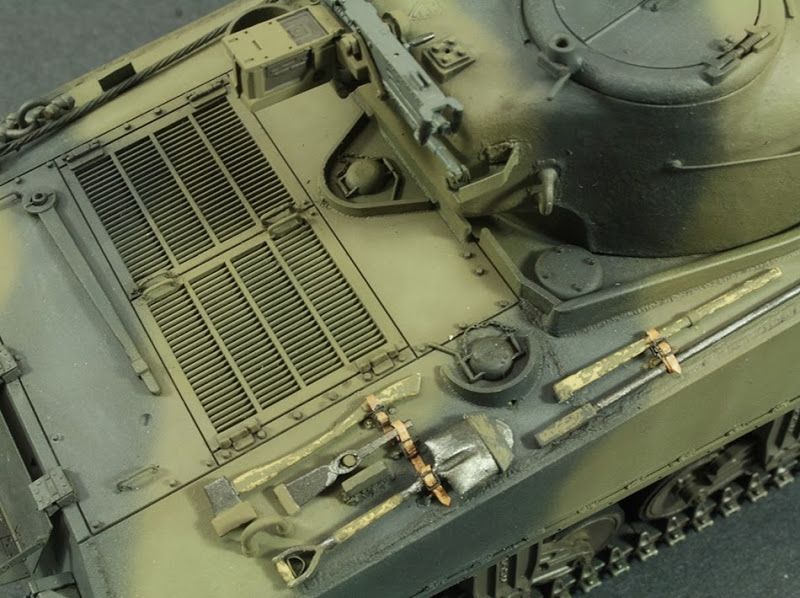 The on board tools of Shermans were often provided by the factories in their natural wood colour, painted in black or Olive Drab.I chose to model the tools painted in Olive drab but with the paint worn away to reveal the natural wood colour of the tools. I used the hairspray method to show this. For the leather straps I used lead foil and buckles from the Aber buckles PE set.
