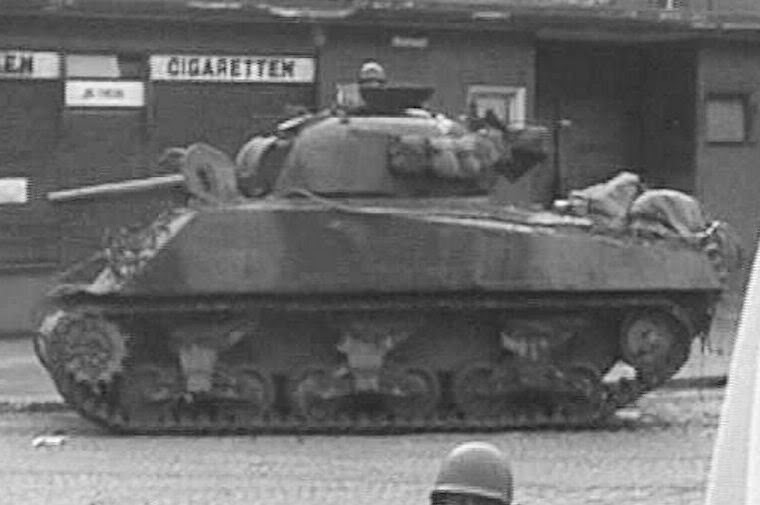 Here's an M4A3(75)W during operations in Cologne. Note the add-on armour on the turret. Also, this particular tank does not have the add-on armour on the glacis which was also seen on a number of 3rd amoured division tanks.