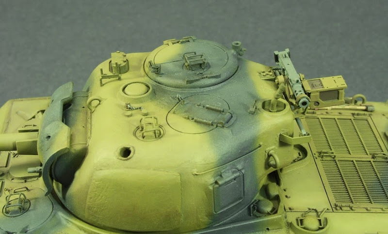 Basecoat on plus some filters and washes. With the exception of some thinned Mr. Surfacer 500 for the very light cast texturing on the turret, glacis, hull side walls and final drive housing, I avoided using any more primer on this tank. Even the metal barrel was sprayed directly with the Tamiya paints I chose. I feel this best results in maintaining the details of the tank itself.