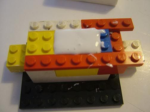 The rubber will find it's way through the legoblocks as you can see. And that's why i put some clay on the bottom of the mould.