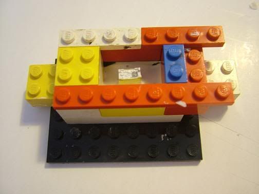 I start with the lego blocks to make the size of the mould. The bottom is then filled up with clay. And on top of that comes the part sicked with bleu-teck on a piece of plastic. If you don't put the clay on the bottom the resin will go under the plastic card and if it works out bas the part you're planning to cast wil not be completely covered, I will show his later on.