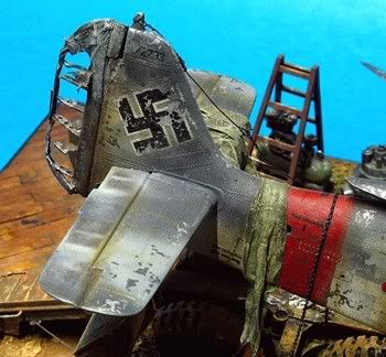 - an inner frame being built for the rear fuselage radio hatch cut out in the right side, bullet holes, pilot flip step on left side, rear of canopy