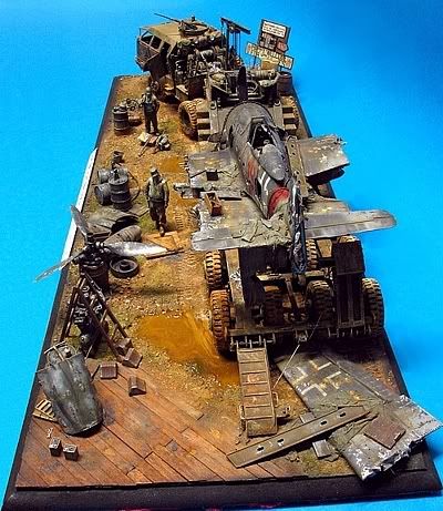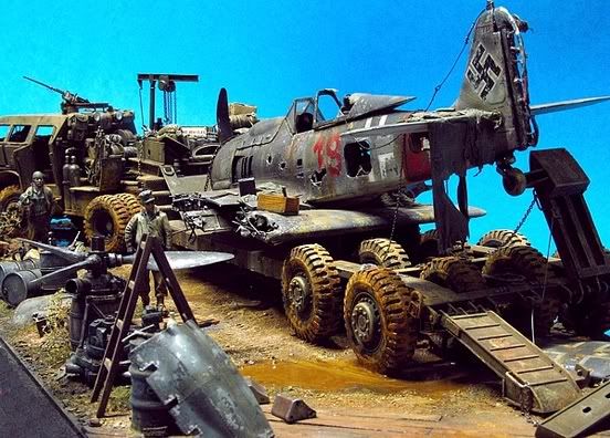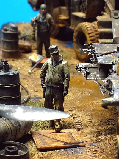Dragon Wagon in Nov. - early Dec. 1944 being used to clean up a forward airfield full of 'left behind fighters by JG 300. USAF want the field cleared for their Mustangs to run sorties into western Germany.The figure walking and reaching for his pistol has heard a noise and is making his way back to check, while his partner just wants to go and have lunch. Lurking behind the trailor is a lone German soldier who has been cut -off from his unit, a fanatic.