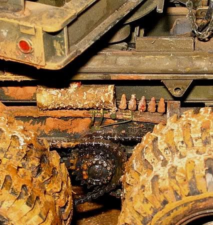 The Dragon Wagon only required a few mods as it was one of the first AFV multi - media kits from the big players. I added the oil resevoirs for the rear chain drive as well as all the small chains needed for handles, pins etc. I also detailed the cab with additions to the rooflighting and warning labels, dash wiring and centre cab box handles. I also relaced the .50 cal with a resin/PE Verlinden one. Numerous bas and packs with straps also added[and the odd crow bar jammed in between stuff too].