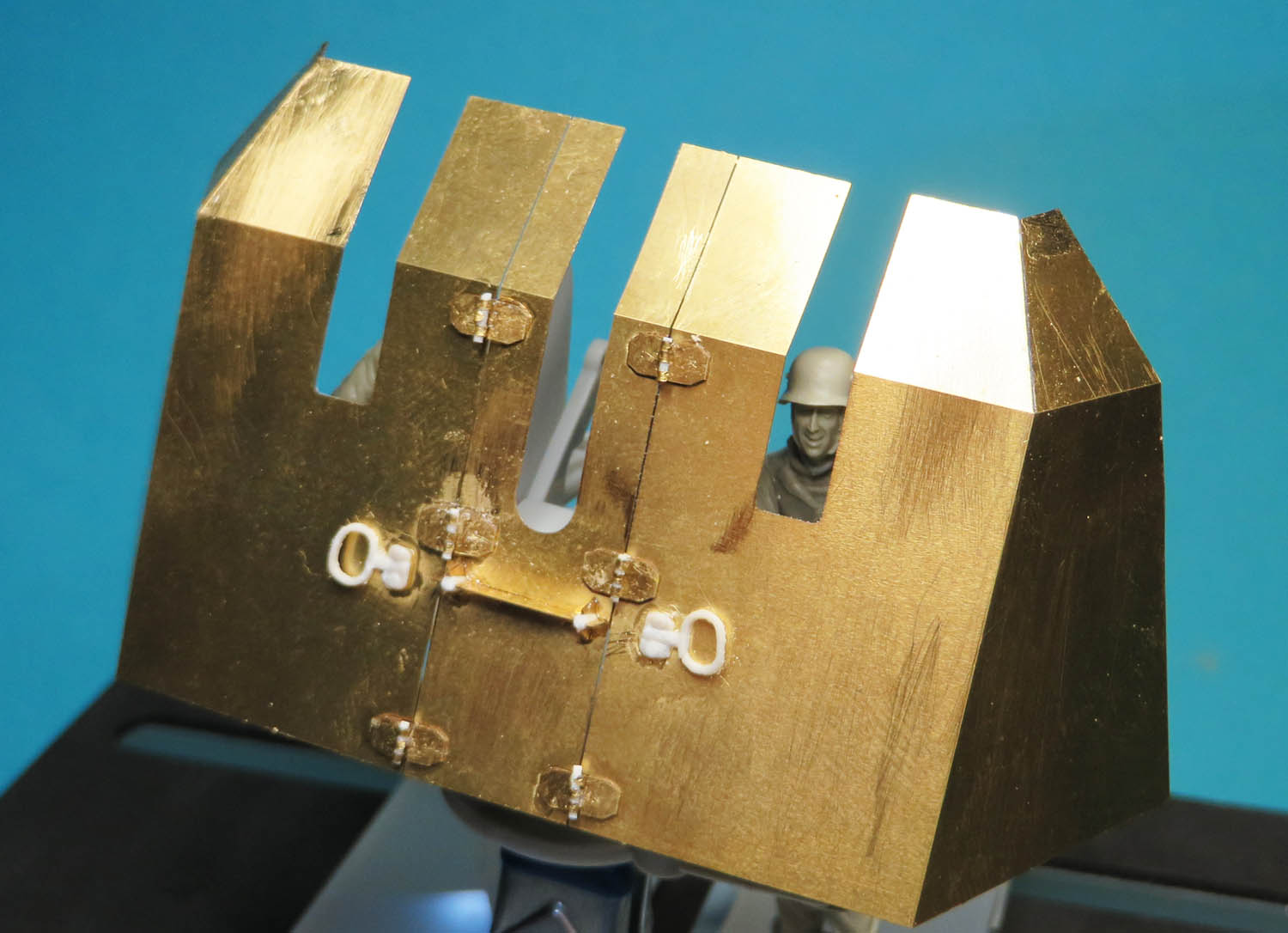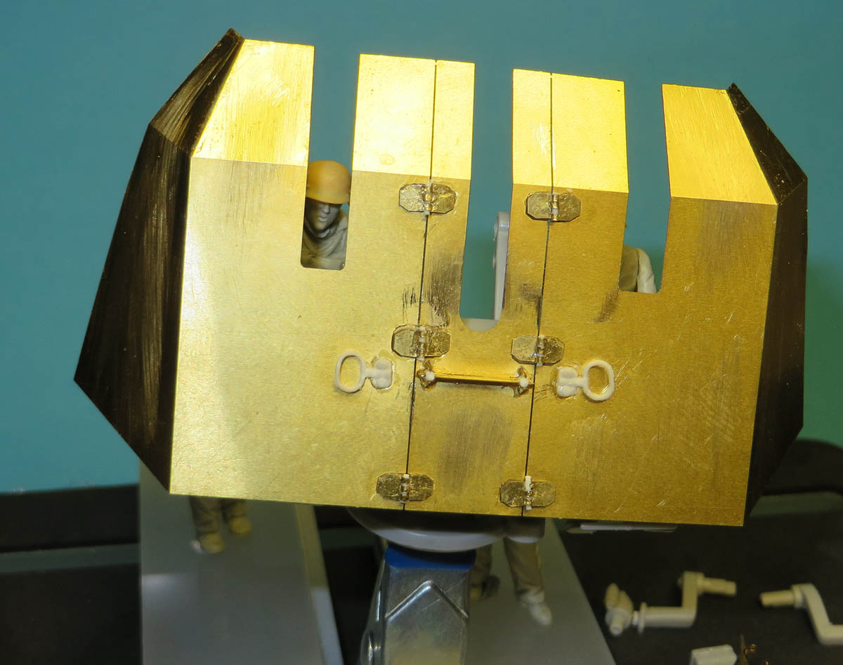 Still one more minor thing to do is to glue the Helmet holders to the inside of the gun shield. Will finish off tonight as it concludes the rear of the gun assemblies.