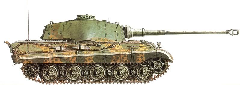 These tigers had all the featues of the last vehicles and did not seem to carry any markings. They are usually depicted with a green base as per the last paint order but there is some debate whether this base color could have been red primer. The color profile i used as a guide is from the osprey King Tiger book. I did not do the paint scheme as an exact copy but did like the idea of the bare steel barrel. I missed the special late model front guards when I did this but Hey , next time I will put them in. I also left out the circles from the cammo as I was trying to depict another vehicle from the same batch and wanted to make it slightly different to the one in the picture.