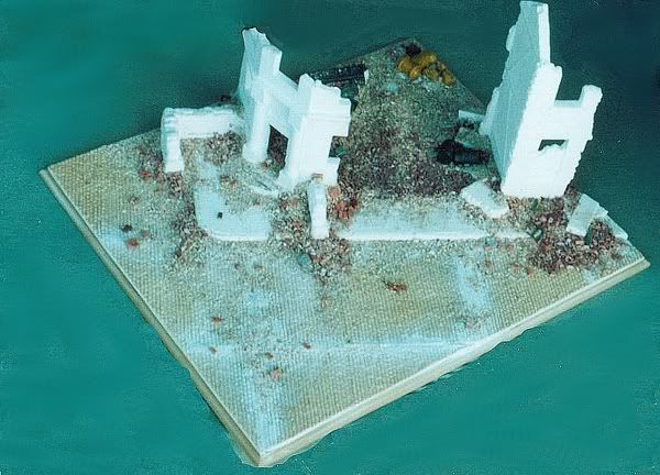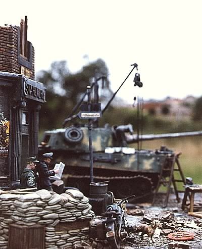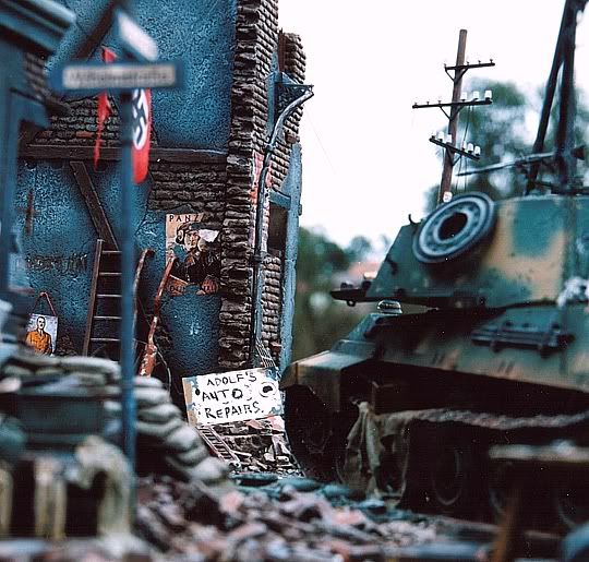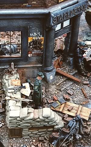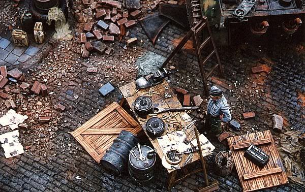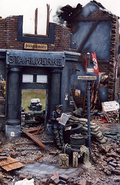 I used Custom Dioramics [CD] and VLD buildings plus CD boxes, cobblestones, wallpaper and some other accessories.