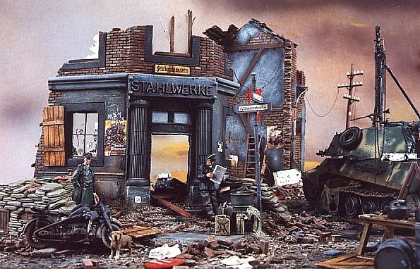 There are various details within the dio that elude to the end of the war through humor [be it dry], so look hard and see if you can find them all [6]. One is Adolf himself standing in the rubble between the buildings