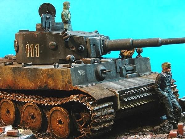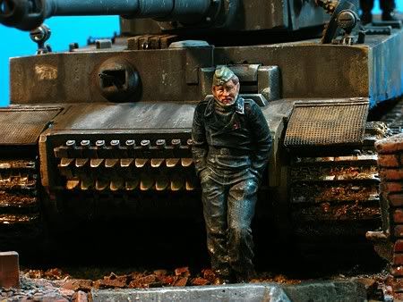 I originally got this Tiger body off Sam Dwyer as a later, early production with guards etc. He had used a Late Tiger 1 Tamiya body with brass, Kasten tracks and wheels, Jordi turned barrel and a full 'scratched' interior. For whatever reason he decided he didn't want it and gave to me. I backdated it further and re-painted it, adding and changing the details to an initial prod. I took two figures from the Brand new Wespe kit and used them as they really looked cold. I used decals from one of the then available Tamiya armor decal sheets [I WISH THESE WERE STILL AVAILABLE]and built up the base in the usual way.