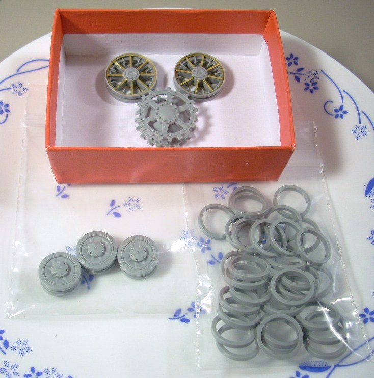 Tires, spare wheels and idler(?) ready to go. Im of course cleaning all parts of flash and ensuring a good fit.