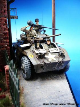 Story with this one is something like this, crew of M8 is patrolling and suddenly they found woman relieveing (I think I used right word ). Tamiya 1/35 scale M8, figures are from MiniArt with resin heads. Some diorama accessories are from Mini Art.