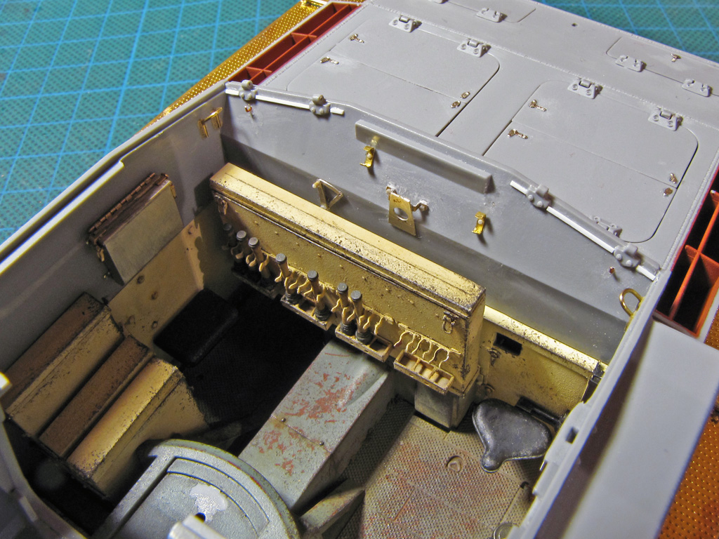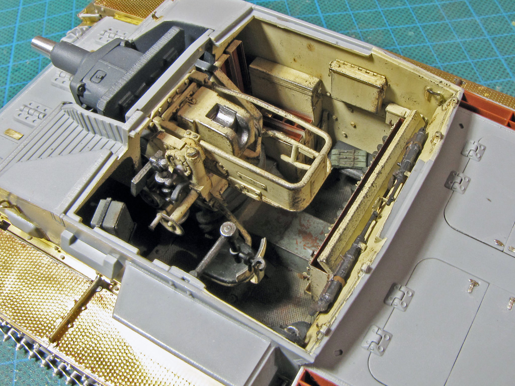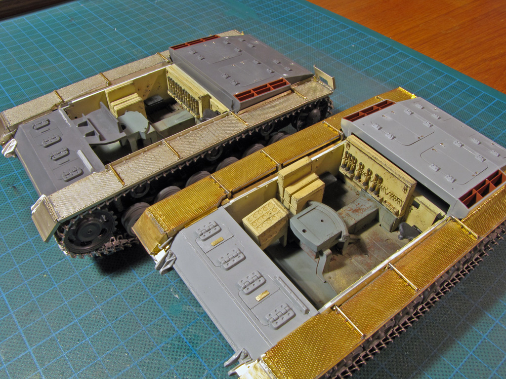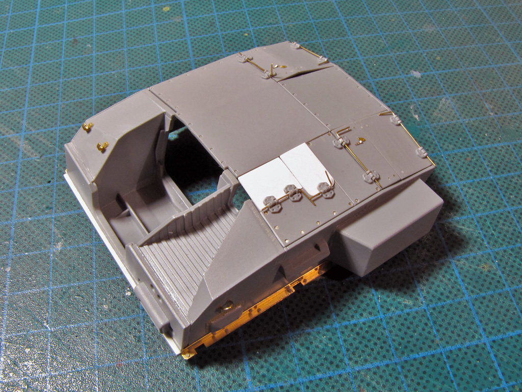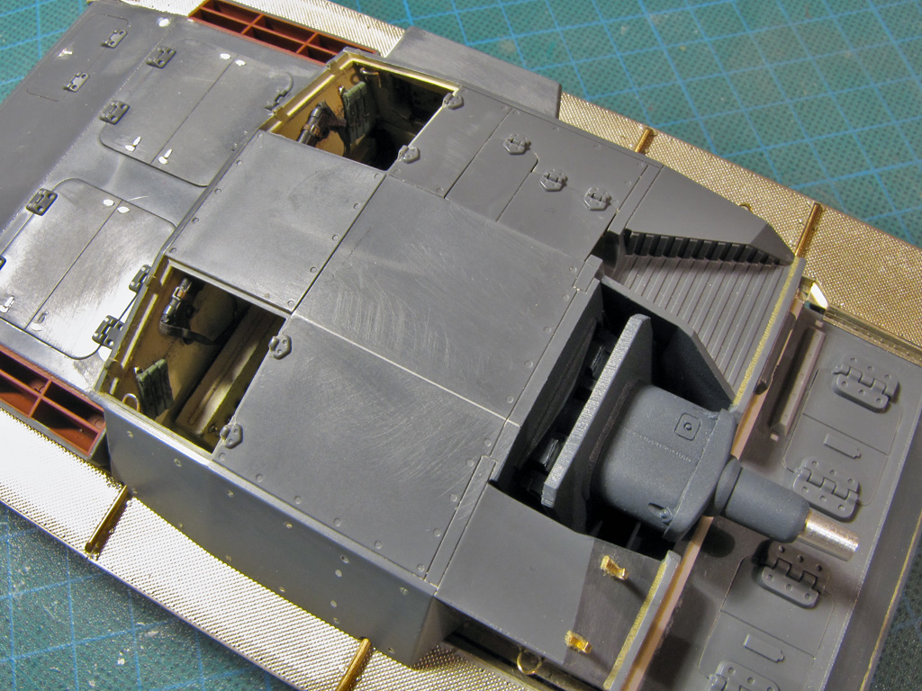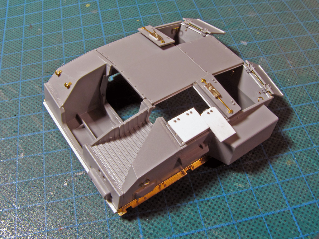The hatches on both had some detailing added. I tried to drill out all the hatches to make them movable - on Dragon it went alright, but Tamiya hinges were a bit too small and not well molded out for this purpose. Dragon had the smaller hatches above the sight shut closed, so these too had to be cut out and to be replaced with homemade styrene ones. On Tamiya I just glued these hatches shut and didn't bother more.