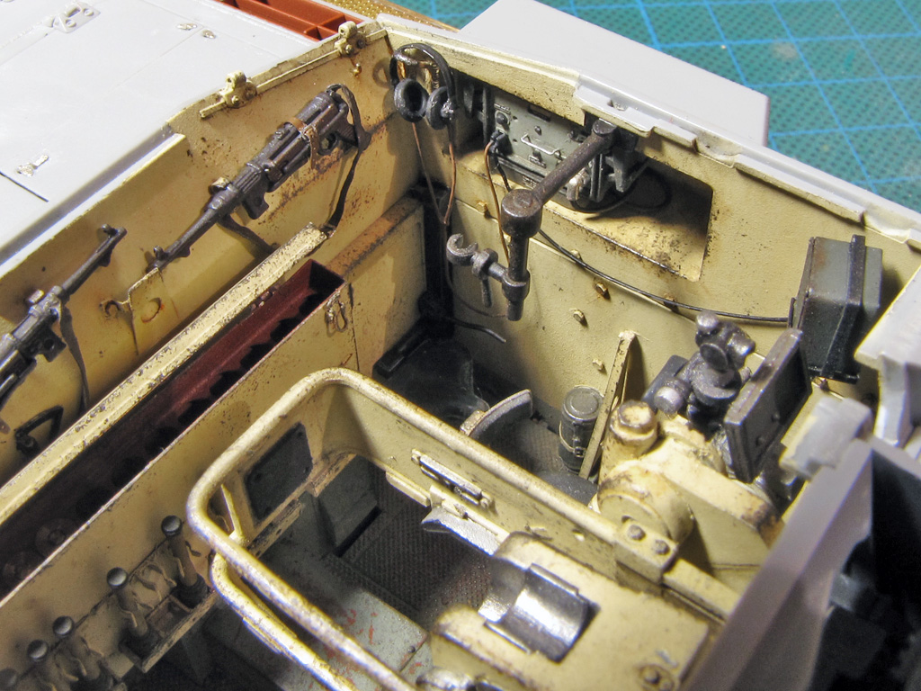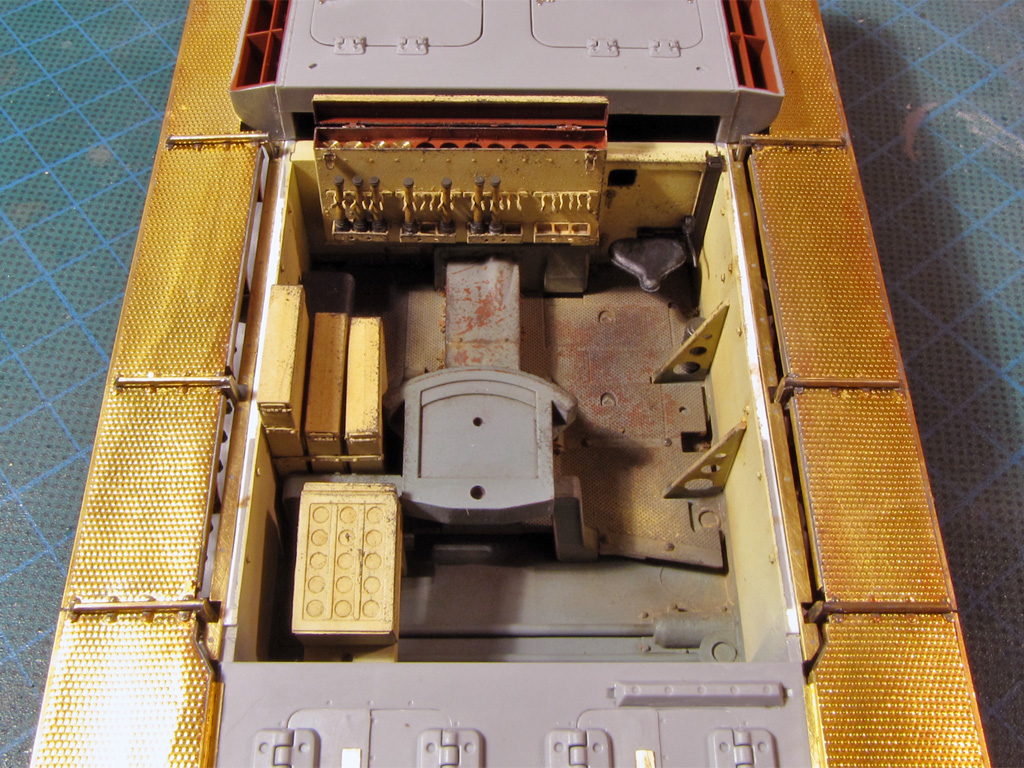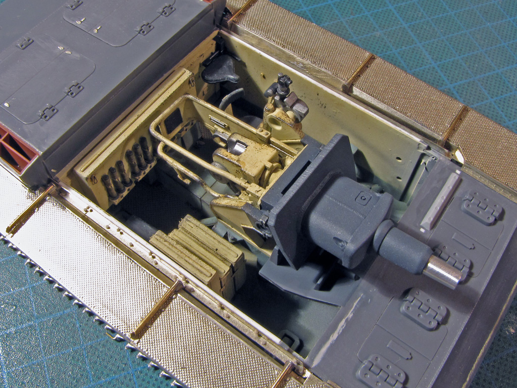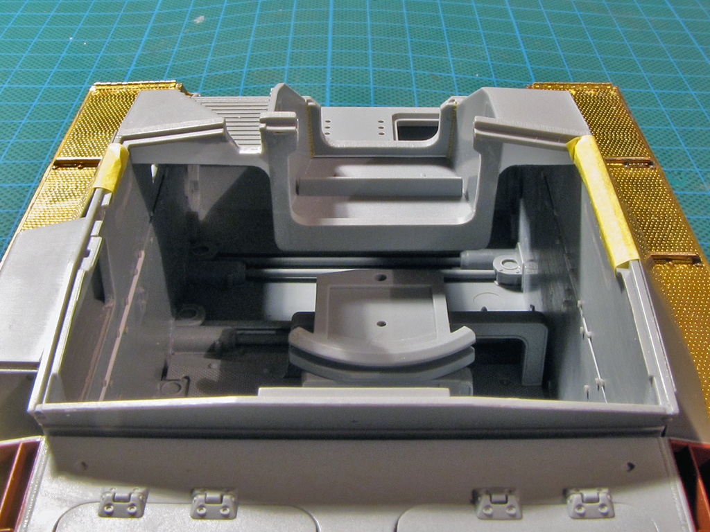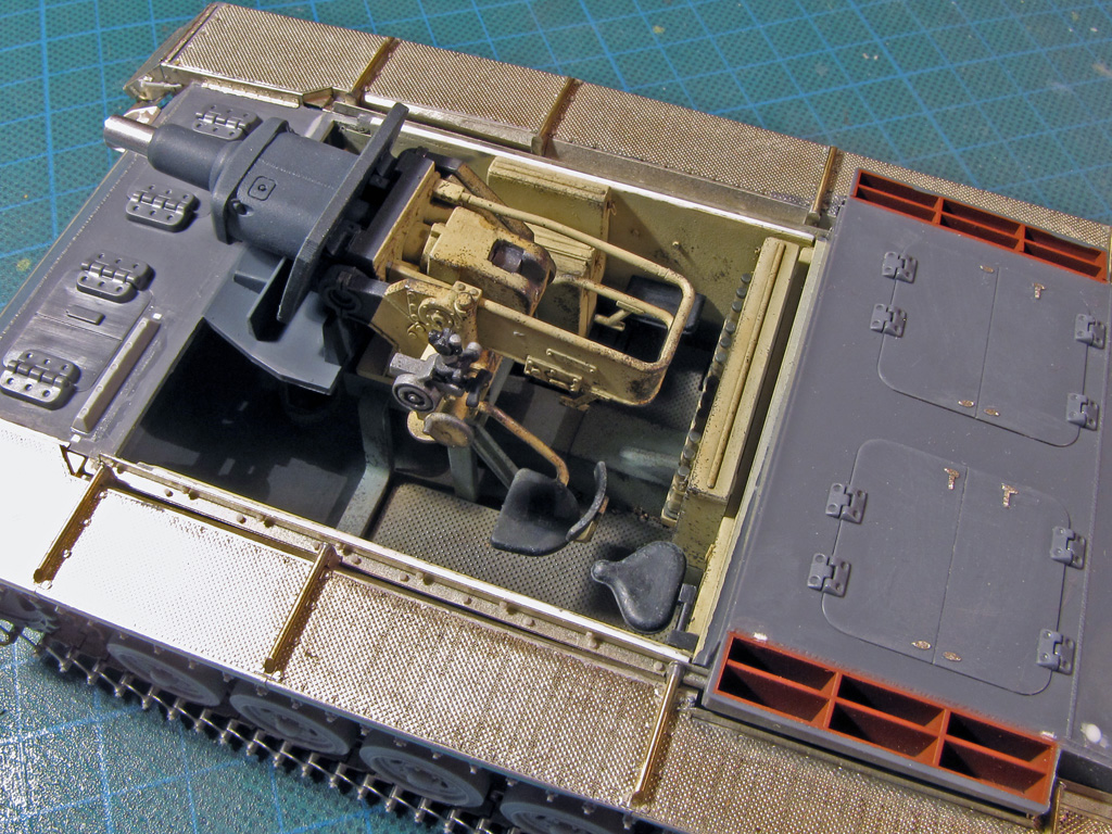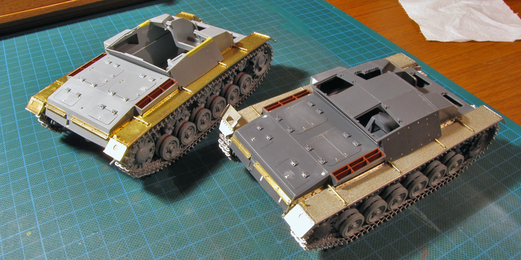 The hatches on both had some detailing added. I tried to drill out all the hatches to make them movable - on Dragon it went alright, but Tamiya hinges were a bit too small and not well molded out for this purpose. Dragon had the smaller hatches above the sight shut closed, so these too had to be cut out and to be replaced with homemade styrene ones. On Tamiya I just glued these hatches shut and didn't bother more.