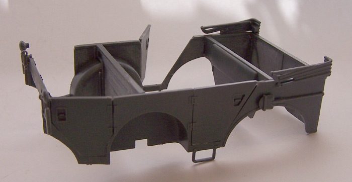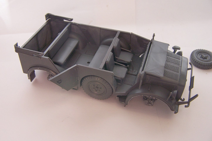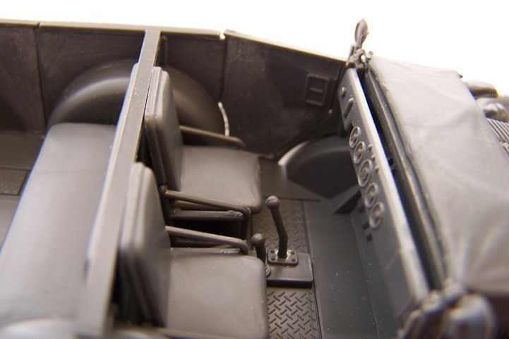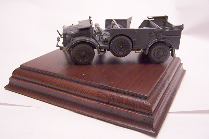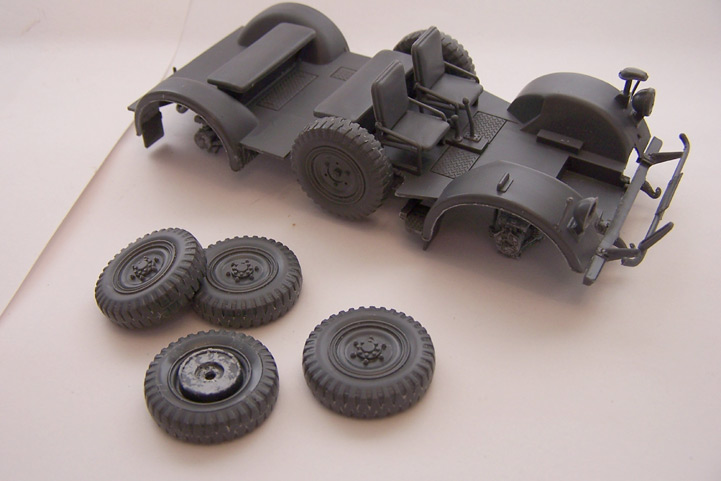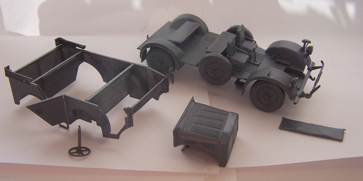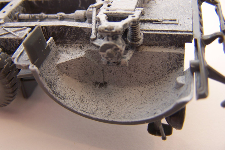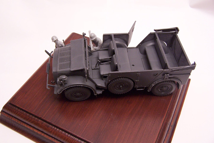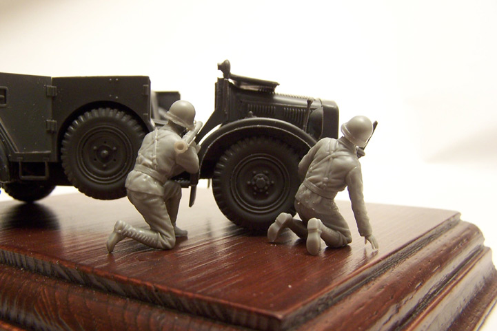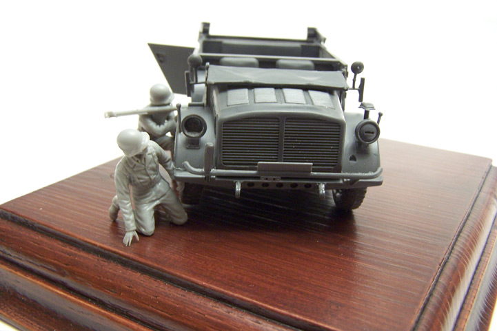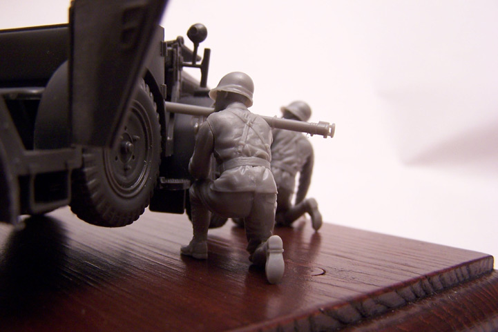 The vehicle in the diorama is a Horch IA which was built pretty much OOTB. I left it pretty much in Subassemblies for painting ease. The figures came from Dragons Allied Tankhunters which gives you a set of two normal GI's and two para's. I used the two normal Gi's. When I was toying around with the figures to create the best position for them I found out that the base I choose for it somehow was a bit to small... both figures initially were planned on the front of the vehicle peering over the fender. Then due to my own roughness I pushed out a frontdoor at the driverside. This gave me a complete new angle of approach and I decided to have the Bazooka man shooting the bazooka through the vehicle using the Horch as his cover. The loader is peering over the fender and the front of the vehicle to the target.