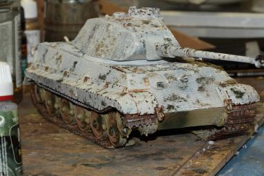 after a long time of rest, i'm coming to my tools again ! Waiting for a King Tiger I ordered, I decided to repaint an old one I did a year ago. The paint was not that good, i wasn't good enough myself with my airbrush. I read a magazine written by a friend of mine about the hungarian front, and it gave me the idea. I put water and salt on various places, painted a light, white coat on it and wiped the salt off before i was totally dry, so some salt could remain and look like frozen snow. Then I used Mig Prod stuff (rainmarks and rust washes, along with Lifecolor Rust 2 acrylic wash), Vallejo paint (German black Brown and Flat brown for the chipping work), and there is still work to come !