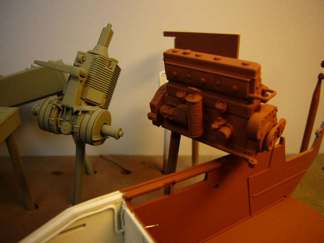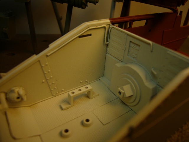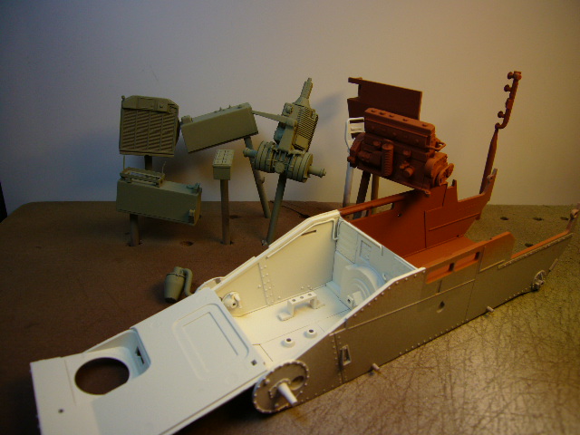Hull interior is rust red in the engine compartment and ivory in the driver's ditto with the larger components such as transmission, radiator and fuel tanks green grey. All colours are Vallejo and so far everything is airbrushed.