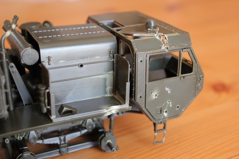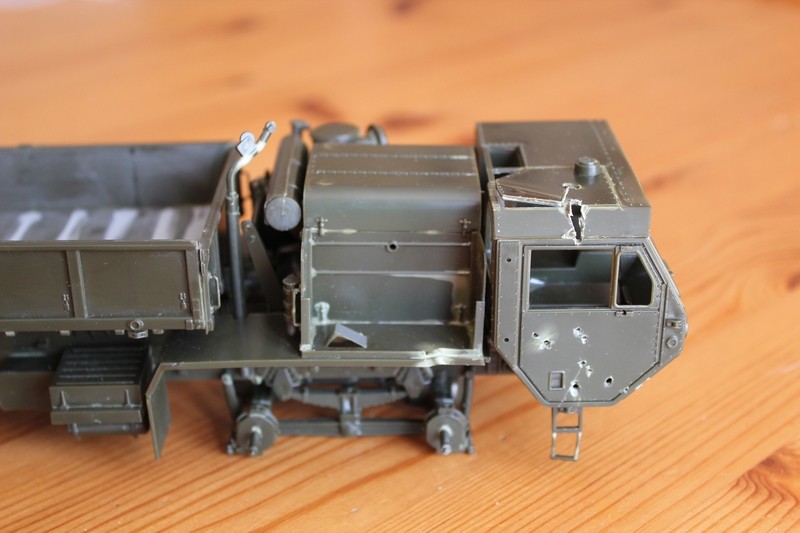 It'll depict a blasted HEMTT, suffering damages from a road side bomb. The IED contained ball shaped projectiles that riddled the passenger door and shot the spare tire, the crane and a portion of the cargo side in the back. I try to stick to the pic above...
