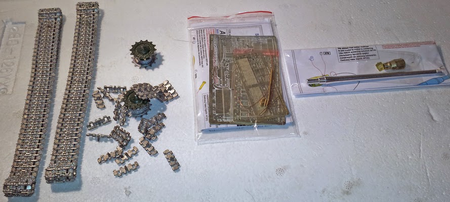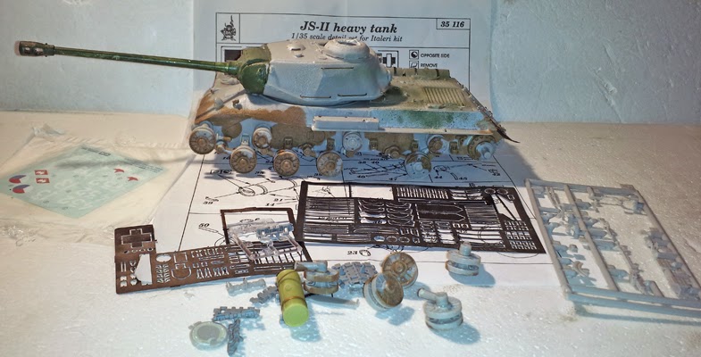 I also managed to snag a partially built kit off eBay: a DML JS-2M UZTM production. It's not in good shape, and many of the wheels have broken off. But what it did come with were Friul tracks, AL-14, already built (though too short, I'll have to add links). I got the whole thing for less than the cost of the Friul tracks). It also came with a metal barrel and a set of Eduard photo-etch for an Italeri IS-2. I think I'm gonna fix it up as well.